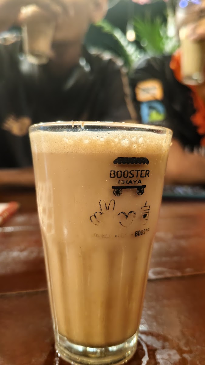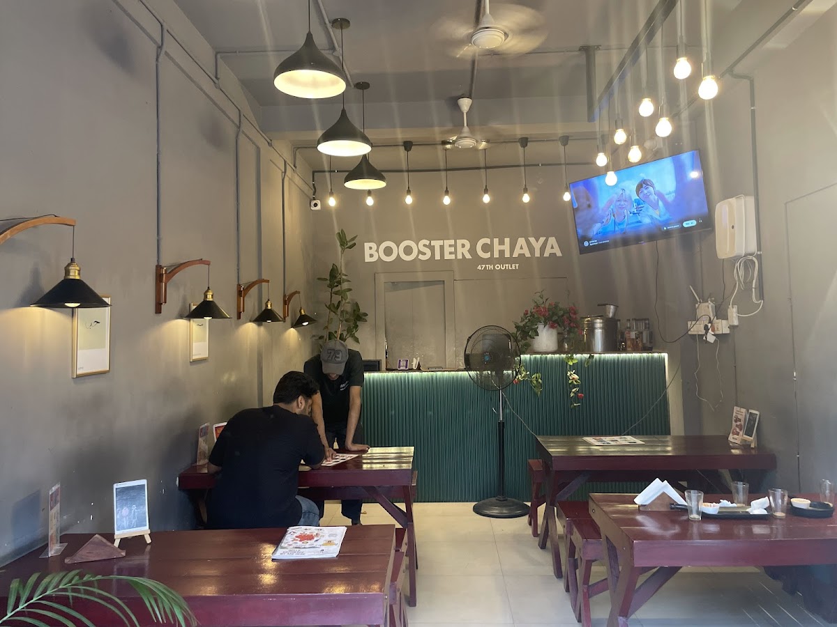 The moment you step into Booster Chaya, you’re enveloped in a warm ambiance enhanced by light and floral decor that sets the perfect backdrop for relaxation. With its cozy corners and serene atmosphere, it's an ideal spot for friends to catch up or for anyone seeking a peaceful escape from the bustling city life.